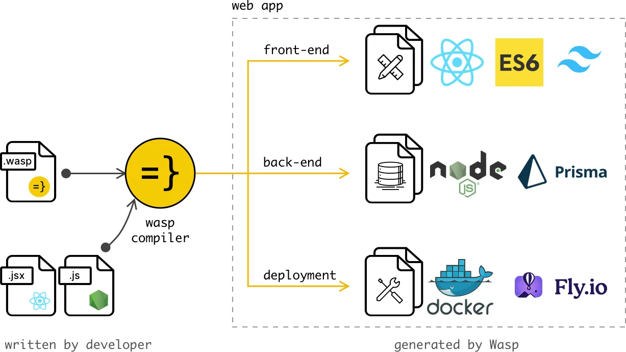 Given a simple .wasp configuration file that describes the high-level details of your web app, and .js(x)/.css/..., source files with your unique logic, Wasp compiler generates the full source of your web app in the target stack: front-end, back-end and deployment.