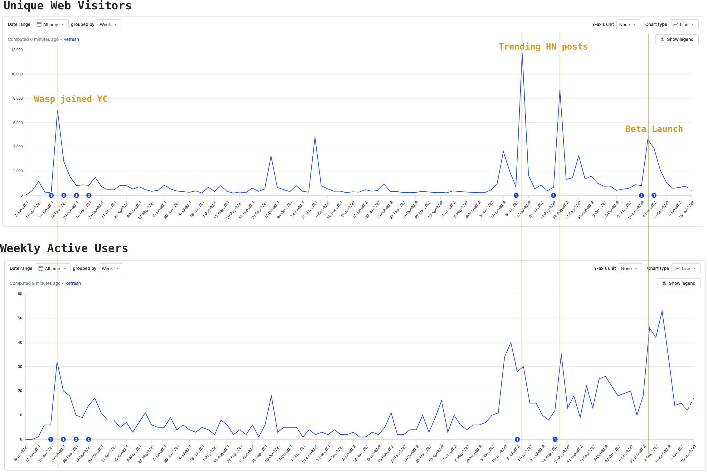 One of the main effects of the launch (together with a few recent successful HN posts, and the Alpha Testing Program we ran in Jul '22) is that we managed to move the baseline WAU from ~10 to ~20. Another effect, felt more subjectively, is the change in the community perception.